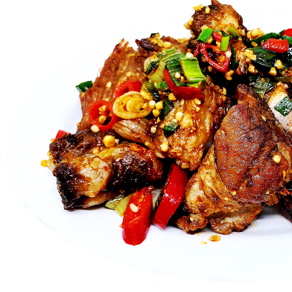 Deep fried spare ribs then quickly stir fried with crushed garlic, fresh chilli, spring onions and spicy salt