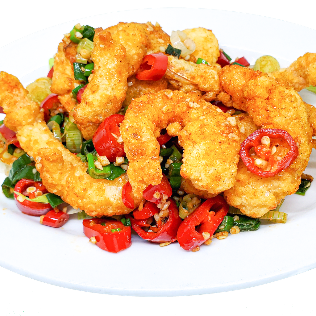 A crispy golden coating surrounds each individual king prawn then quickly stir fried with crushed garlic, spicy salt, fresh chilli and spring onions