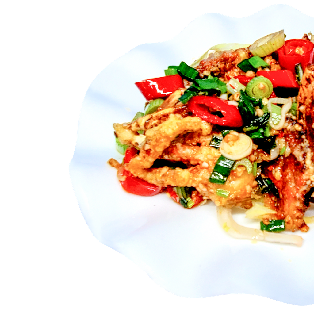 A crispy & golden coating surrounds each individual crab then quickly stir fried with crushed garlic, spicy salt & fresh chilli & spring onions