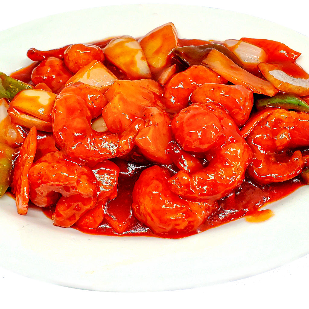 Slightly coated king prawn, deep fried and served with green peppers, onions and pineapple in sweet and sour sauce