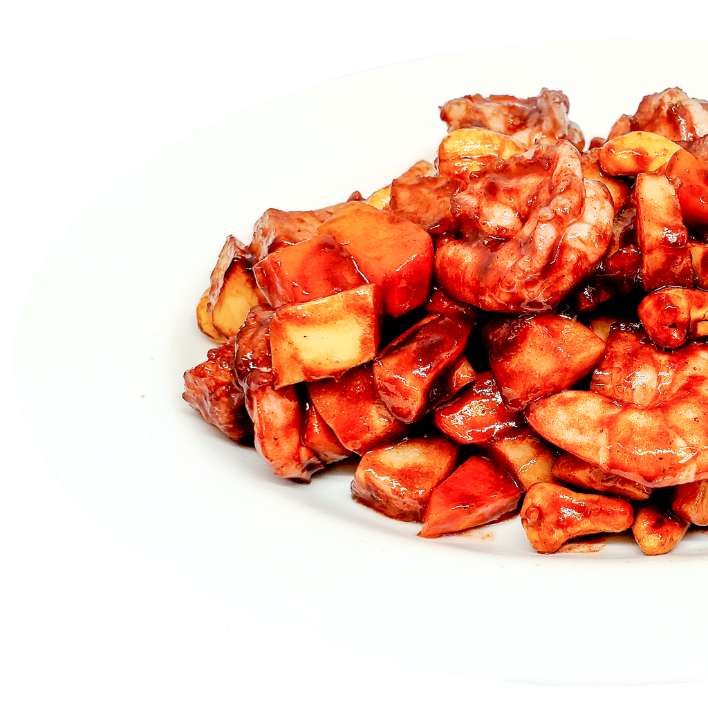 Fried king prawns with cashewnuts & diced bamboo shoots in spicy yellow bean sauce