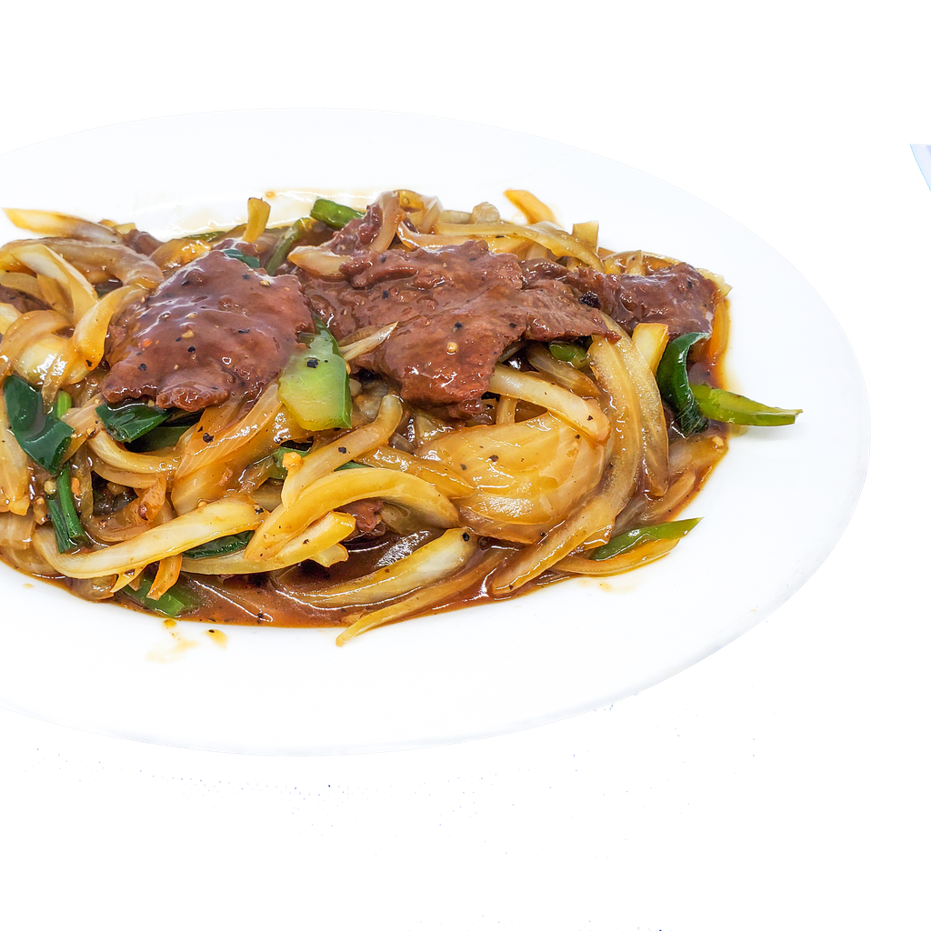 Fillet steak slices with onions & green pepper cooked in a hot pepper sauce