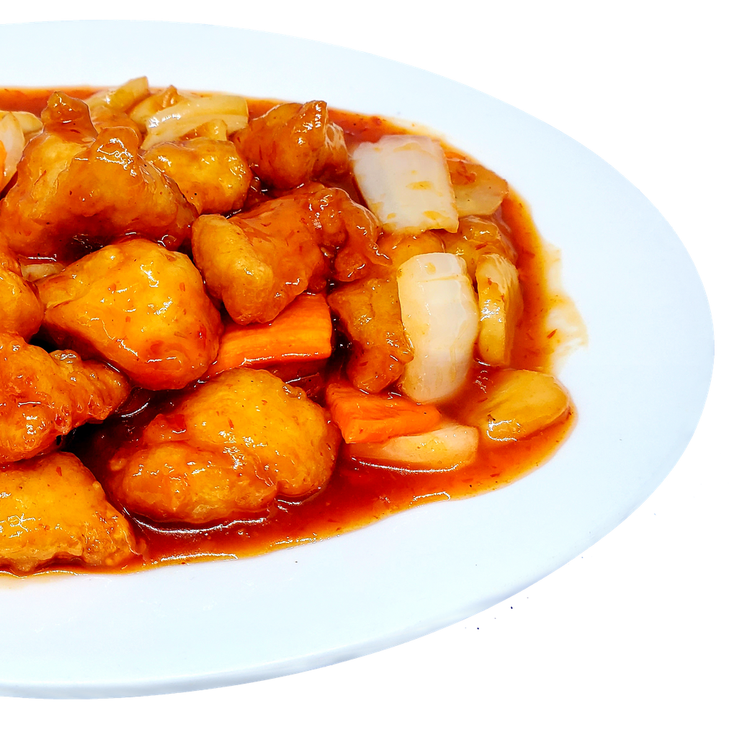 Diced chicken coated lightly with batter, deep fried served with water chestnut in sweet and sour and chilli sauce