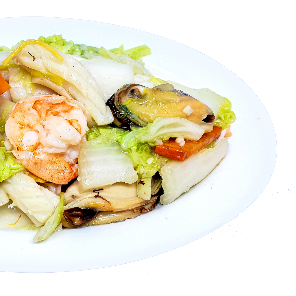 Seafood fried king prawns, squid, green mussels and vegetables on top of grilled noodles