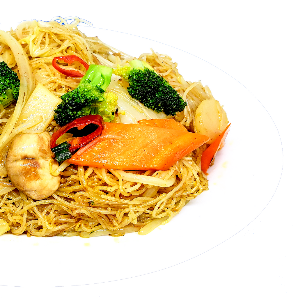 Fine rice noodles cooked with curry powder, vegetables & chilli